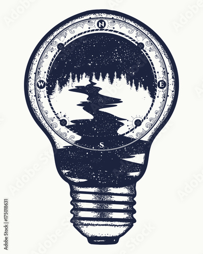 Star River Flows From The Compass In A Lightbulb Tattoo Art Travel